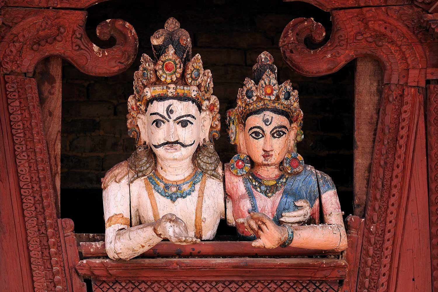En face, de l’autre cote de l’allée, et avant l’entrée du palais royal, se dresse le Temple de Jagannath. C’est le plus ancien du Square, particulièrement connu pour les motifs érotiques en peinture polychromes dont il est orné. Mais ces petites sculptures représentant des scènes d’accouplement sont en réalité éclipsées par la beauté des autres sculptures monumentales en bois représentant des déesses dansantes ou des démons malfaisants.Juste à côté, remarquez l’effrayant bas-relief de pierre peint de couleurs multiples de Bhairav, l’avatar maléfique du dieu Shiva.