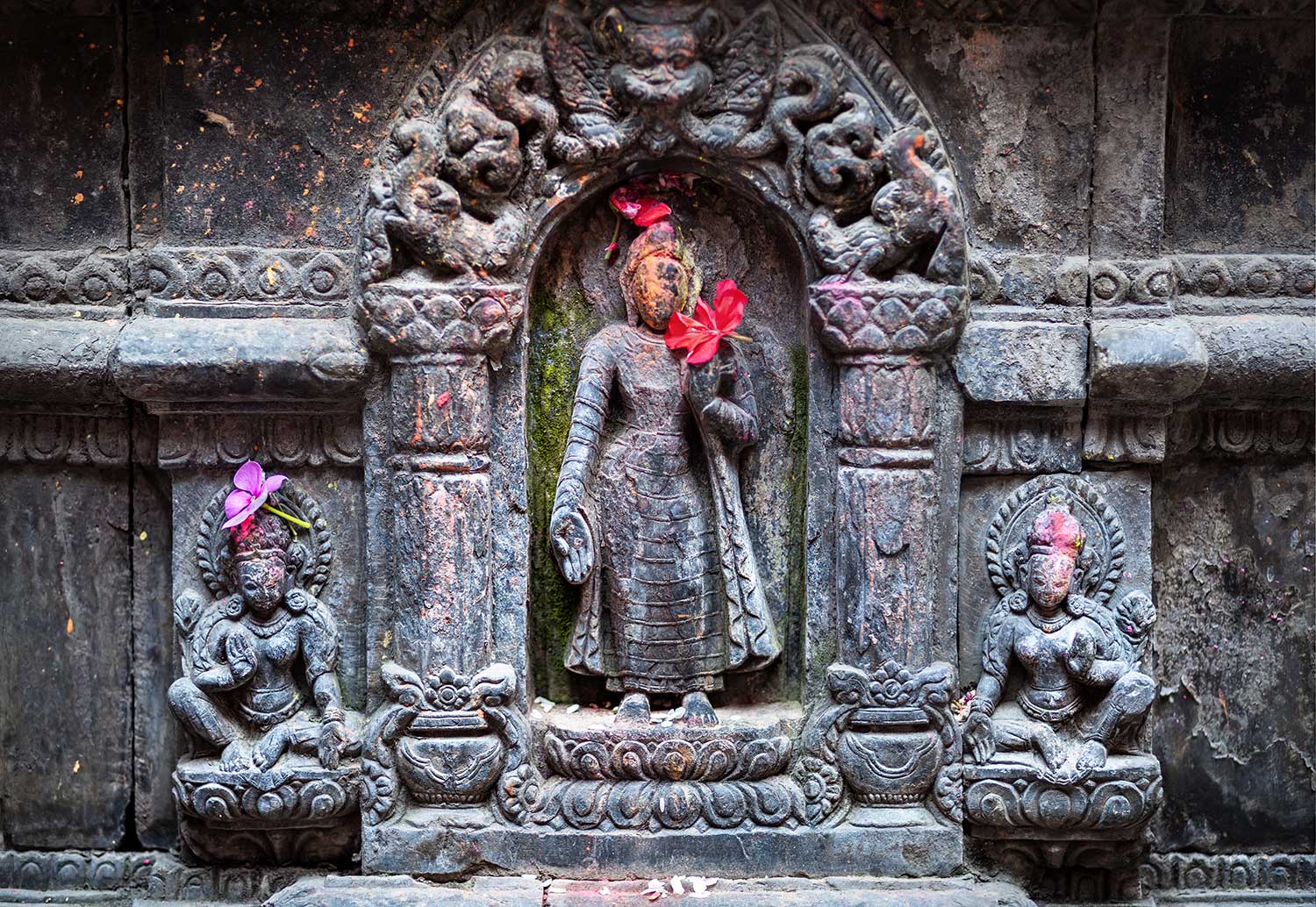 A l’image du Durbar Square, le temple de Krishna est étonnant, surchargé et envoûtant. Edifié au XVIIeme siècle en style sikhara c’est à dire en forme de pain de sucre et entièrement taille dans la pierre, il est le plus ancien de ce genre au Népal. Il est constitué de trois étages rectangulaires et surmonté de vingt et un pinacles d’or ornant autant de petits toits, ce qui lui confère une allure originale unique au Népal. Les détails des gravures sur les frises au-dessus des piliers sont également remarquables. Elles représentent de nombreuses scènes du Mahabaratah et du Ramayana, les deux célèbres épopées hindoues et sont impressionnantes de précision.